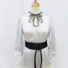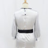 Blusas y CamisasBlusa de raso, media manga con adorno óvalos ribeteados de tela negra en escote y lazo negro en cintura de la marca Almatrichi. Es de color gris perla y la tenemos en una talla 40. Está en muy buen estado.